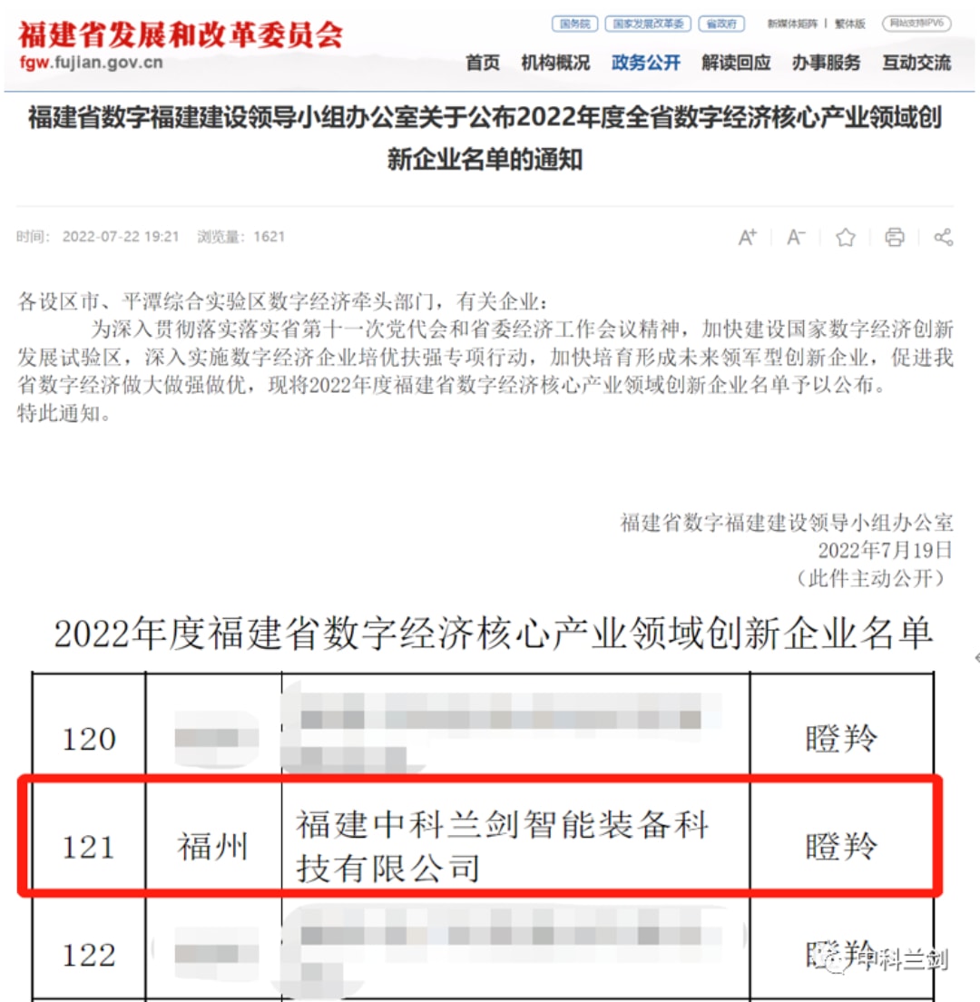 7月19日,福建省發改委公示2022年度全省數字經濟核心產業領域創新企業名單,中科蘭劍作為福建省本土智慧物流裝備代表性企業,以高技術和高成長性成功通過認定,入選數字經濟“瞪羚”企業。