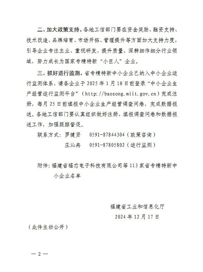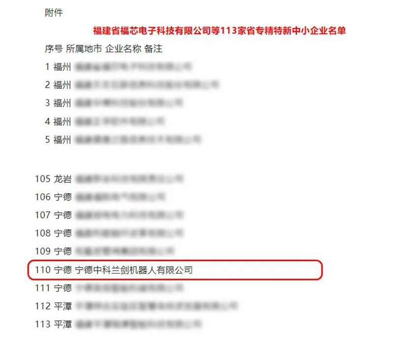 近日,福建省工業和信息化廳公布113家省專精特新中小企業名單。福建中科蘭劍智能裝備科技有限公司全資子公司寧德中科蘭劍機器人有限公司(以下簡稱寧德中科蘭劍)成功獲選“省級專精特新中小企業”認定稱號。這一榮譽不僅是對公司技術研 發創新及市場服務能力的認可,也標志著公司整體經營規模水平穩步邁上新臺階。